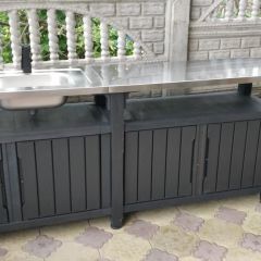 UNITY CHEF - Садовая кухонная столешница с шкафчиками и раковиной – незаменимая мебель для садовой вечеринки или барбекю. Укрепленная столешница из нержавеющей стали и встроенная раковина. Компоненты подачи и отвода воды: фитинг для садового шланга, фильтр и шланг 90 см/3’. Закрываемые шкафчики и исключительно большая полка. Ножки с регулированием высоты. Ручка из нержавеющей стали, держатель для бумажного полотенца, 4 крючка и открывашка для бутылок. Прочная конструкция из пластика, не требующая ухода. Легкий монтаж, легкое пользование, легкая чистка.