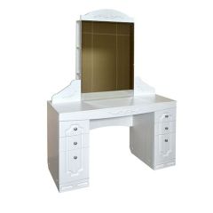 Это очаровательное трюмо состоит из столика с 4 выдвижными ящиками на шариковых направляющих, двух закрытых полок внизу и большого зеркала.